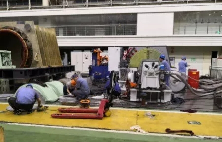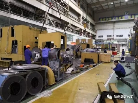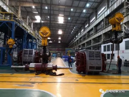 电机制造部装配工段在核电制造部吊挂配合下同时进行第五台总装、第六台电机预装工作