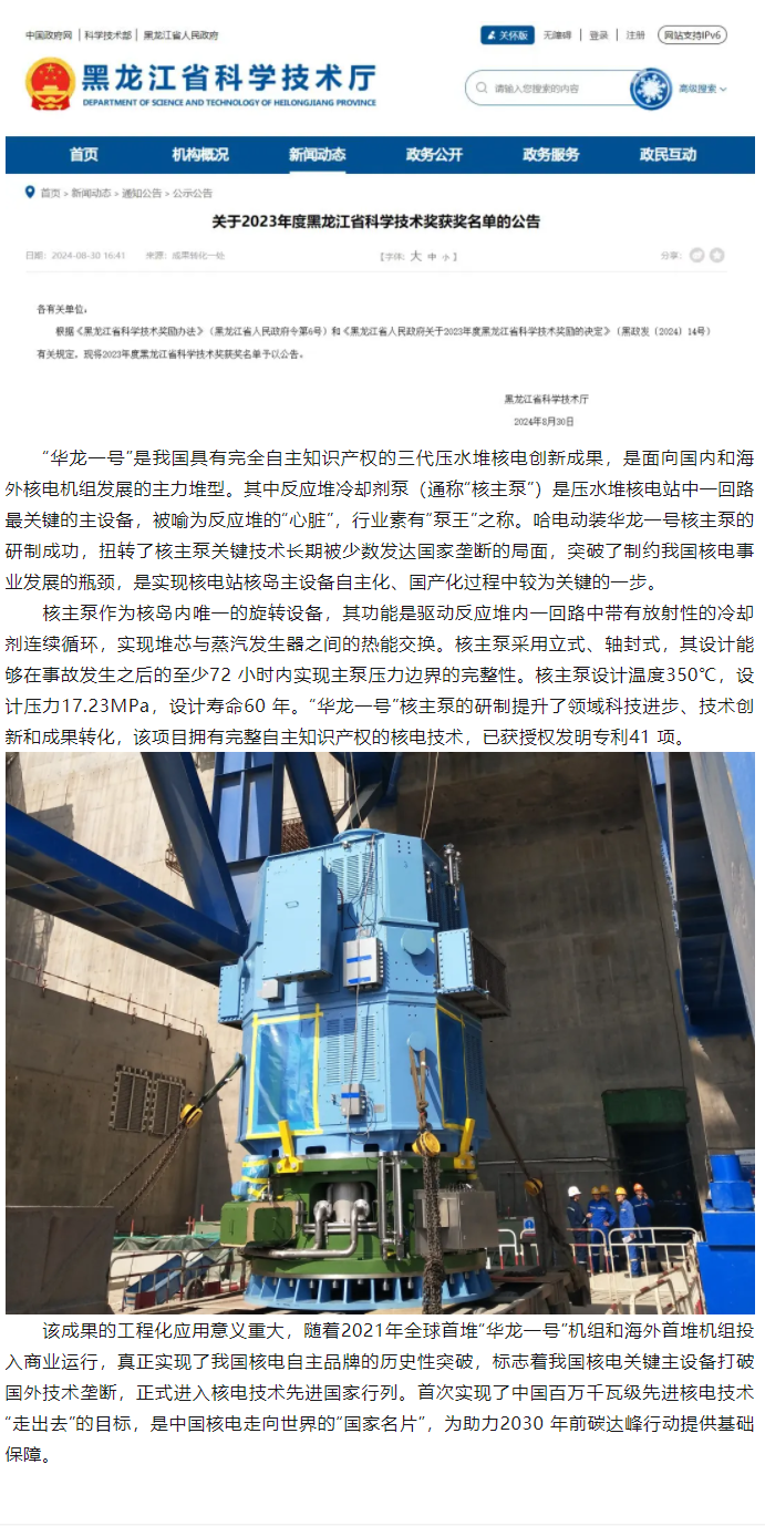 喜报!“‘华龙一号’反应堆冷却剂泵组研制及工程化应用”荣获黑龙江省科技成果转化一等奖